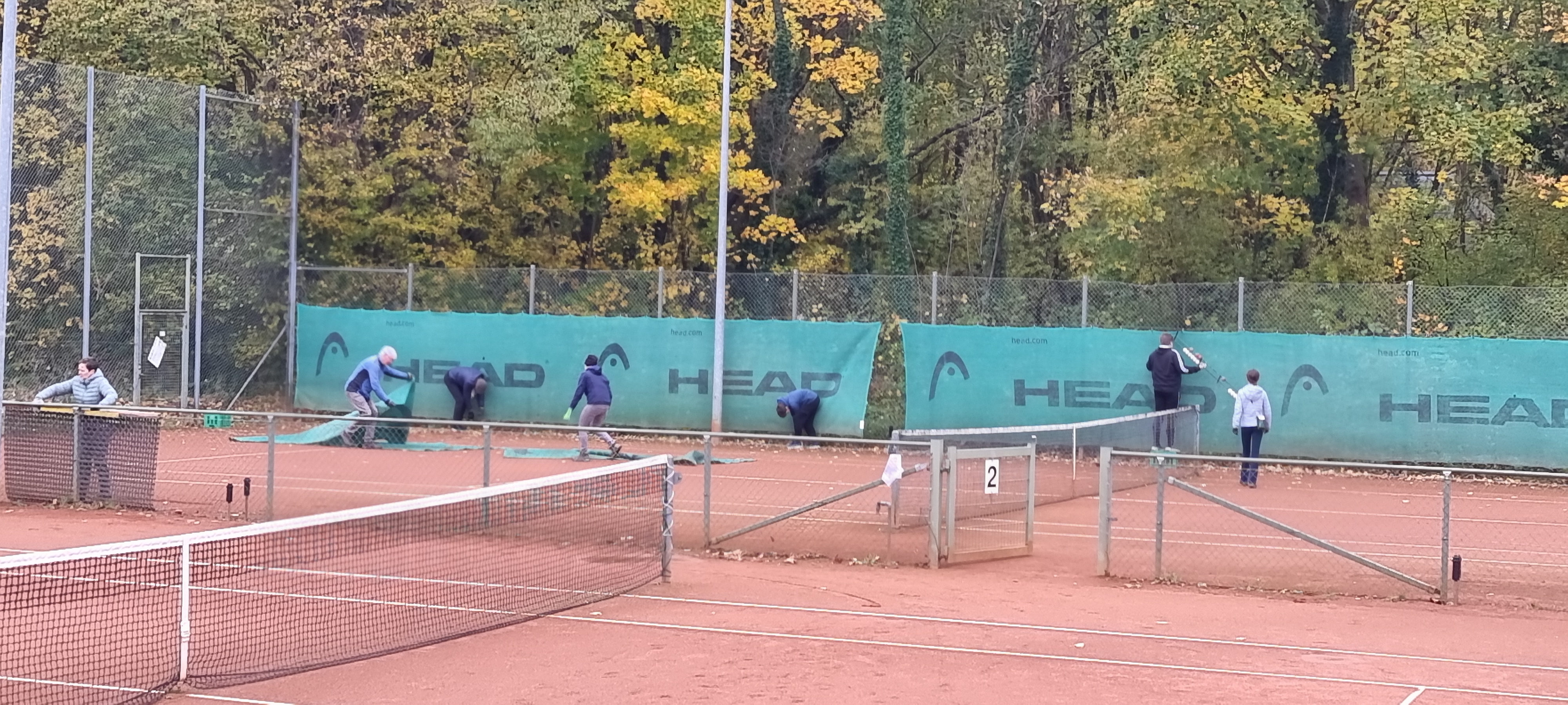 Nu er der vinterlukket for tennis på grusbanerne  De mange fremmødte havde travlt med at fjerne windbreakers, net og alt det løse udstyr. Ligeledes blev borde og bænke sat til vinteropbevaring.